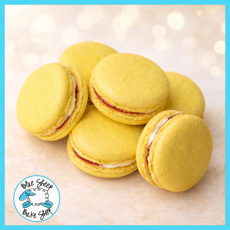 Lemon Swiss buttercream & raspberry preserves filled French macarons.