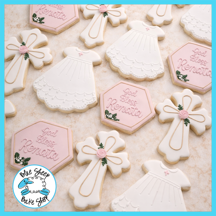 Featuring classic motifs such as crosses, christening gowns, and personalized plaques, each cookie is handcrafted using our signature vanilla sugar cookie base and finished with smooth fondant and delicate piping.