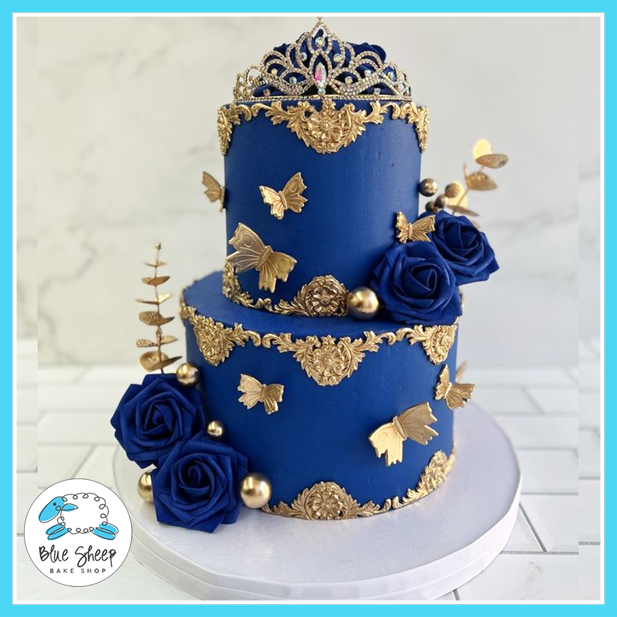 This two-tier royal blue and gold crown cake is the epitome of elegance. Decorated with metallic gold butterflies, baroque detailing, and crowned with a sparkling tiara, it’s the perfect cake for a birthday queen or a royal-themed celebration.