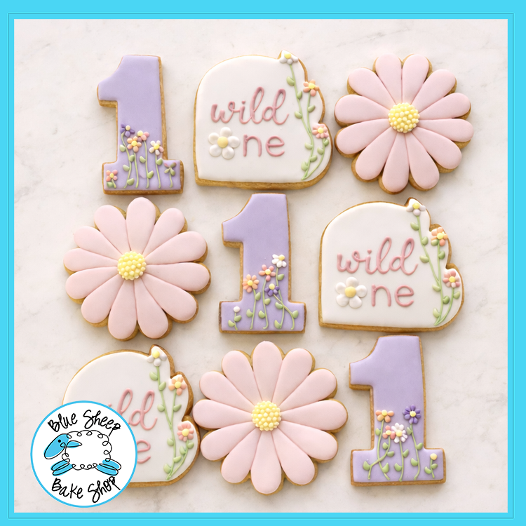 Celebrate a sweet first birthday with our Wild One floral cookie set. These hand-decorated sugar cookies feature soft pastel florals, daisy designs, and “Wild One” lettering—perfect for a garden-inspired or boho first birthday celebration.