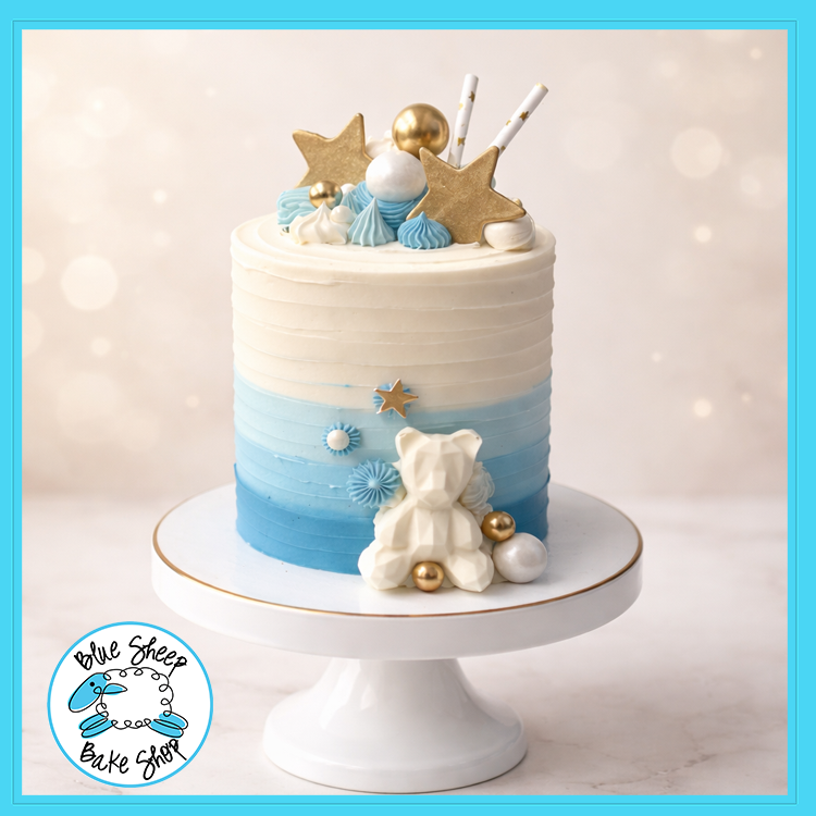 Our Blue Ombré Teddy Bear Birthday Cake is a modern and elegant take on a classic childhood favorite. Featuring textured buttercream with a soft blue ombré finish, this cake is accented with gold details, fondant stars, piped buttercream swirls, and a molded chocolate teddy bear topper for a clean yet playful design.