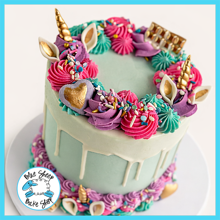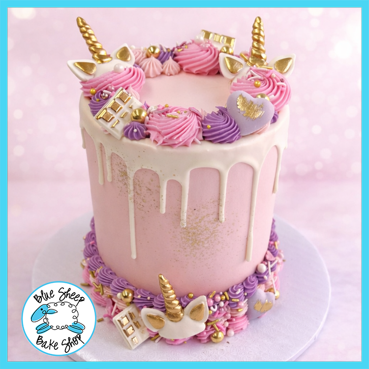 Bring a little magic to your celebration with our Unicorn Birthday Cake! This pastel pink cake is topped with a glossy white drip, shimmering gold sparkle, and hand-piped buttercream swirls in lavender, teal, and pink. It features fondant unicorn ears and horns, gold accents, and edible charm toppers for a whimsical finish.
